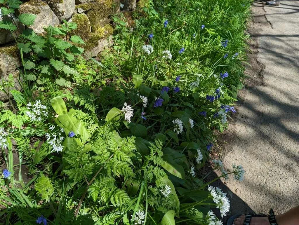 There were a few steep climbs today and the resulting steep descents. For the most part it was along riverbeds and country lanes. Wildflowers were in bloom along with wild garlic. Dawn made me taste it, and it did have a subtle garlic flavor. As we continued, hills opened up around many corners and the lush countryside was filled with birds. I spotted six hares. There is an active program to repair deforestation in the area. Young trees are protected by cylinders made of screening or plastic.